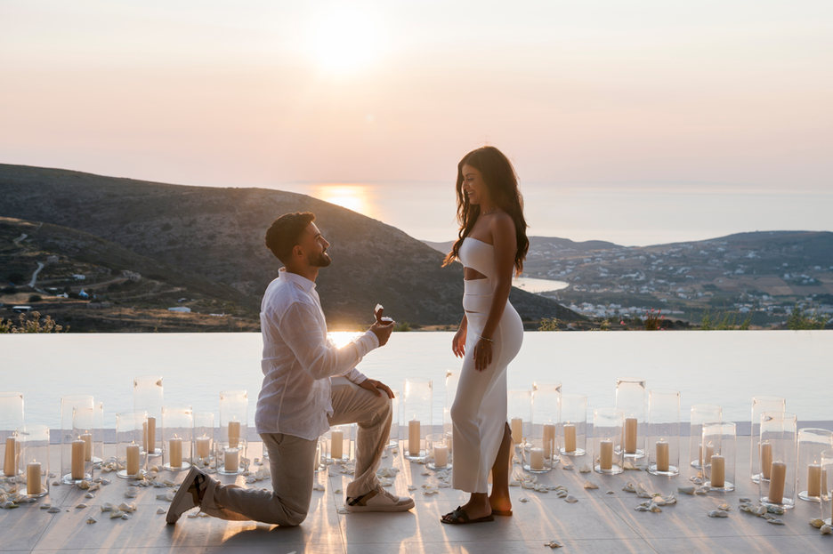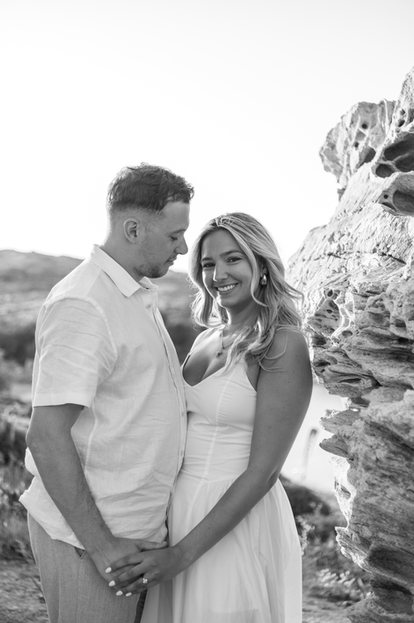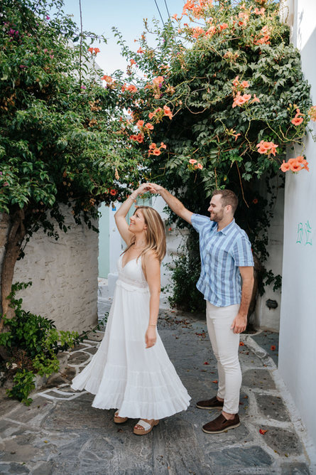 I captured a beautiful couple from America in Paroikia, Paros, exploring its charming alleys. They ended the day with a sunset proposal, creating unforgettable memories.